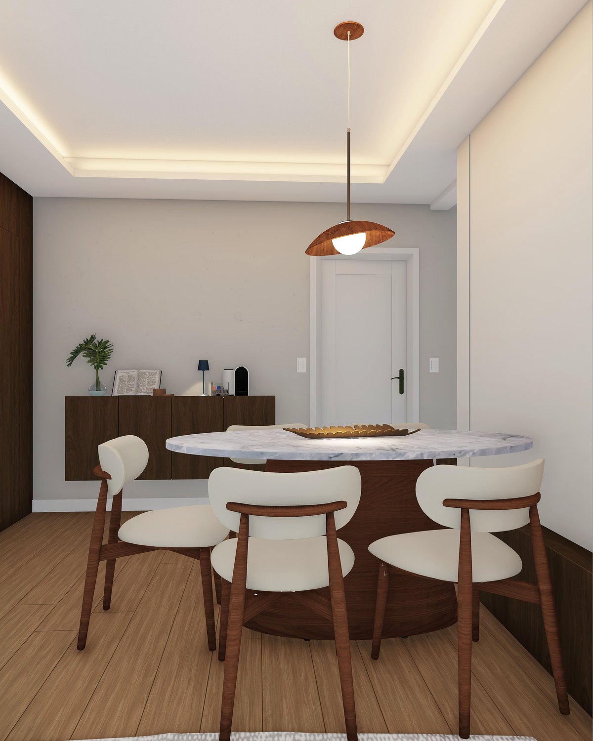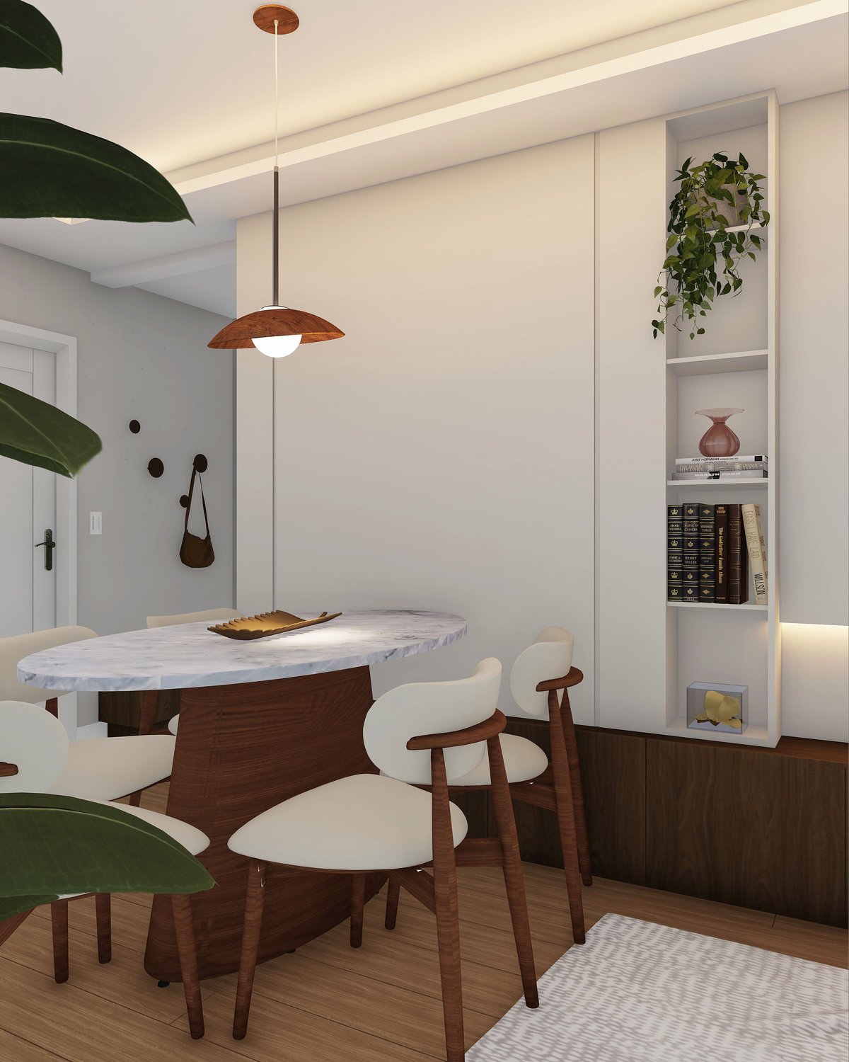 A madeira em tom mais escuro contrasta suavemente com as paredes e a marcenaria claras, criando equilíbrio e transmitindo paz. As plantas ganham protagonismo, trazendo vida e movimento, enquanto o piso mais rústico da varanda resgata a memória afetiva de um quintal, convidando a desacelerar.
