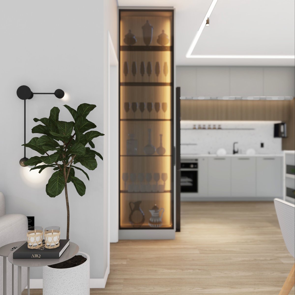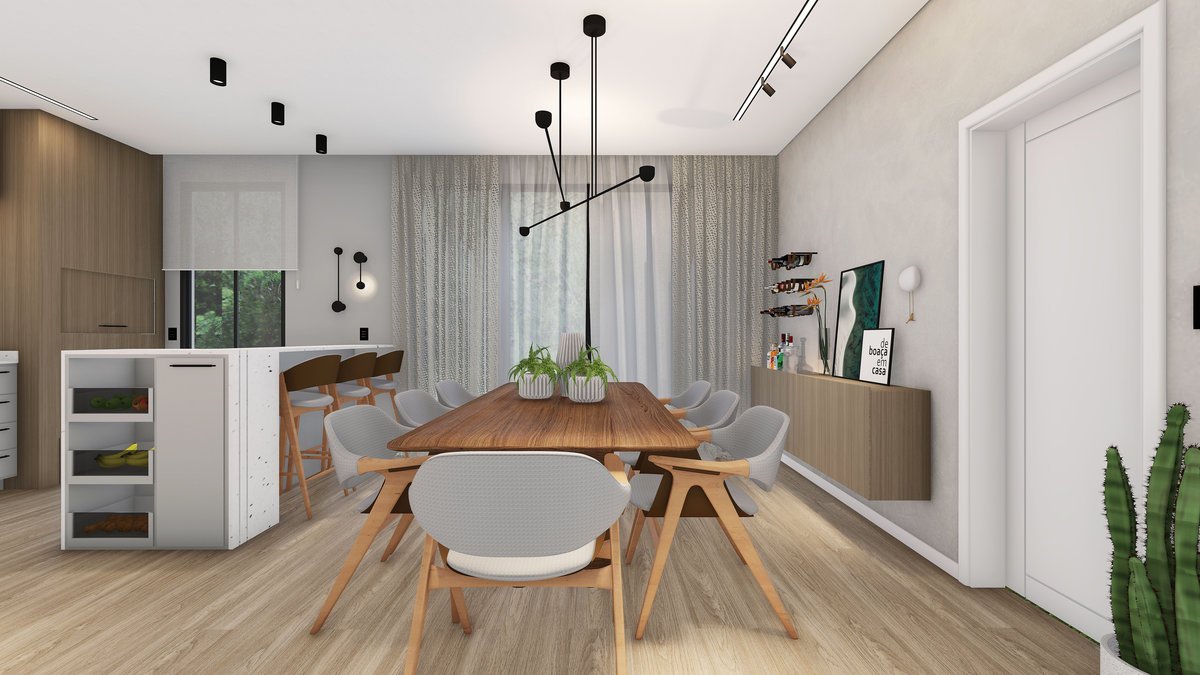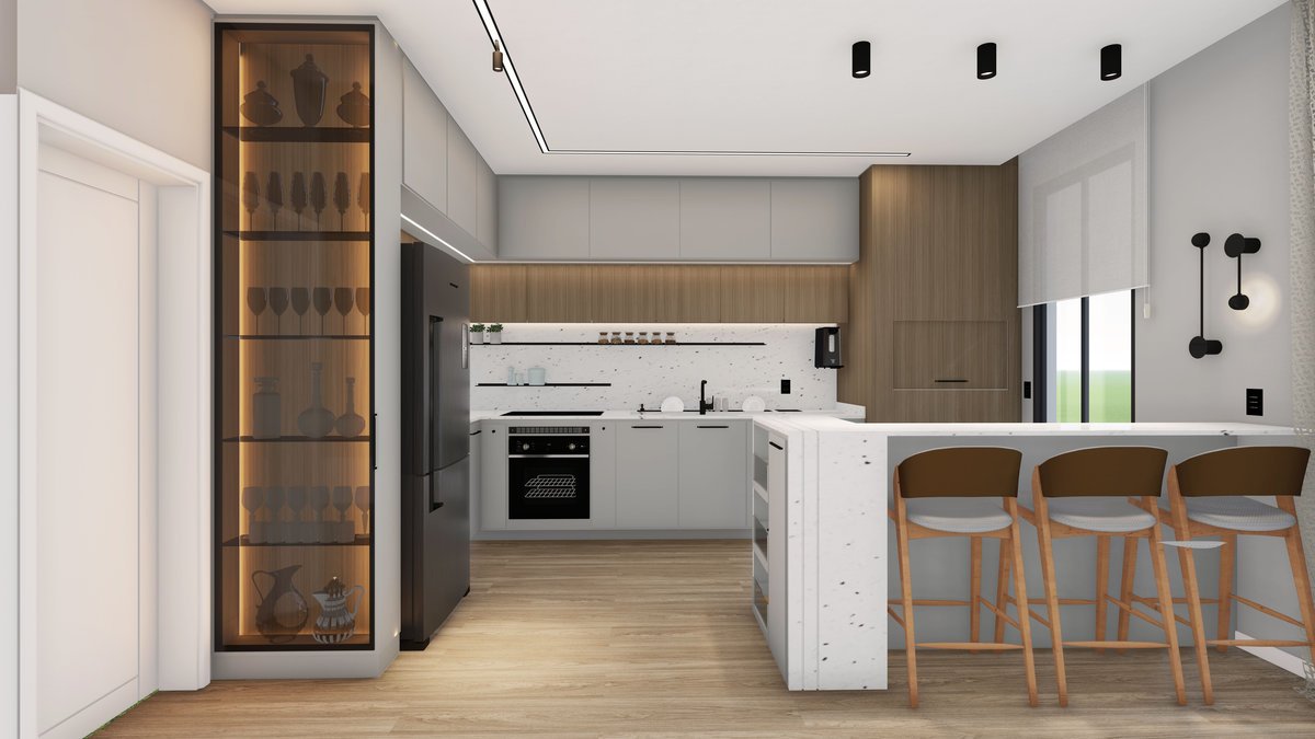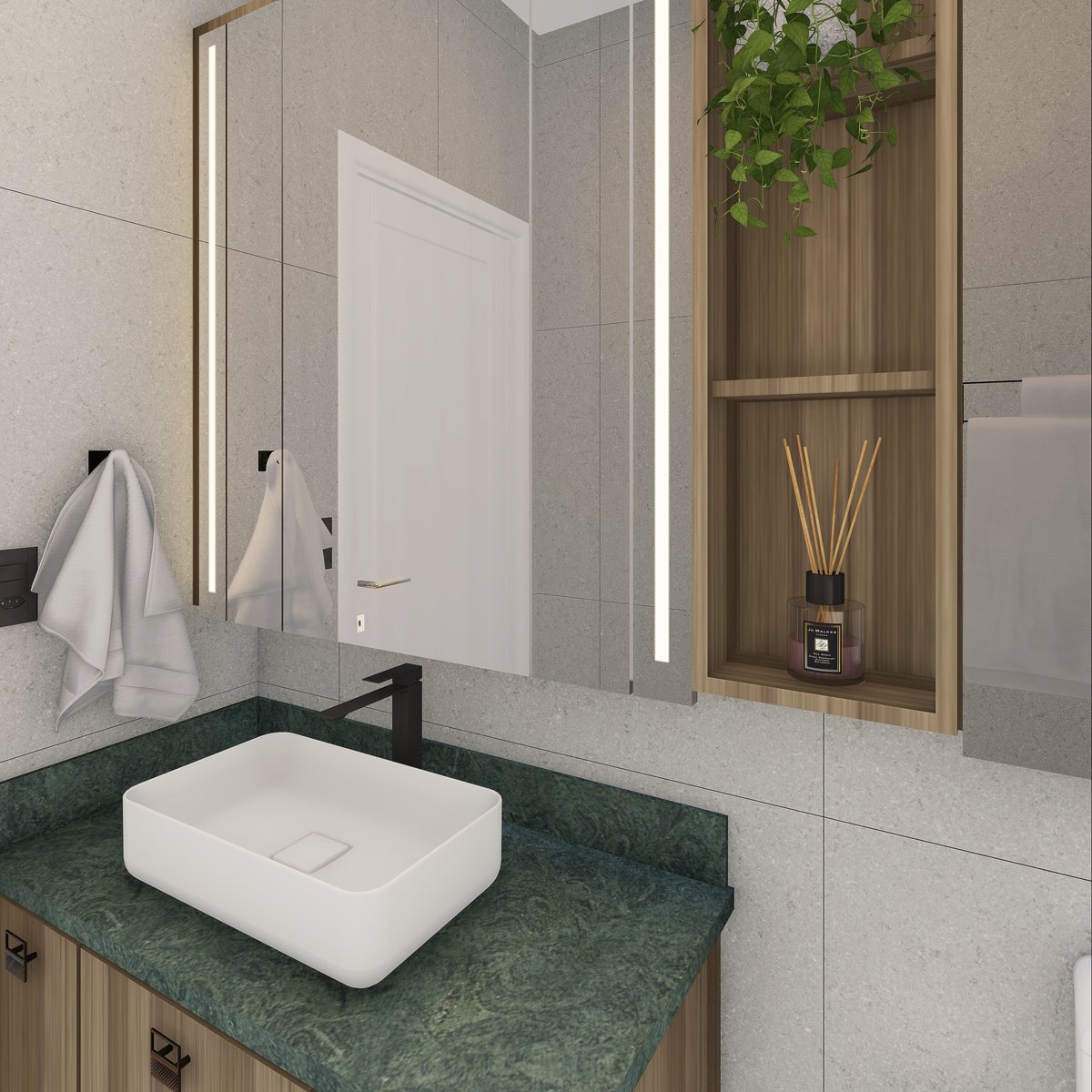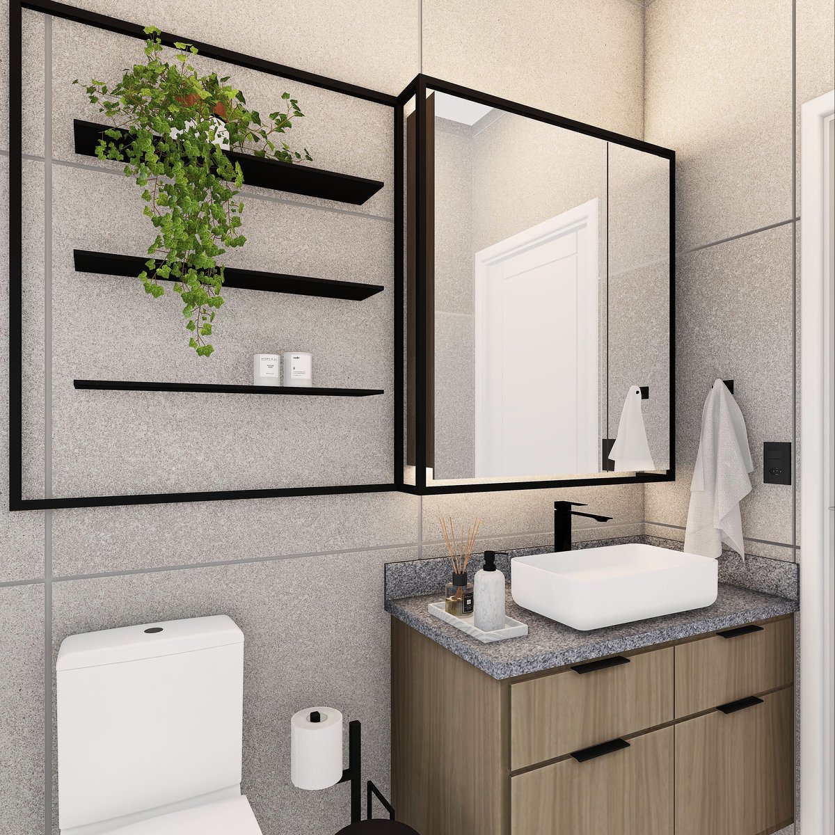 O toque biofílico aparece de forma sutil, com texturas naturais e madeira, que trazem calor, conforto e conexão com a natureza, equilibrando a sobriedade do projeto. Cada ambiente foi pensado para funcionalidade, bem-estar e integração visual, garantindo que os espaços sejam ao mesmo tempo práticos e convidativos.